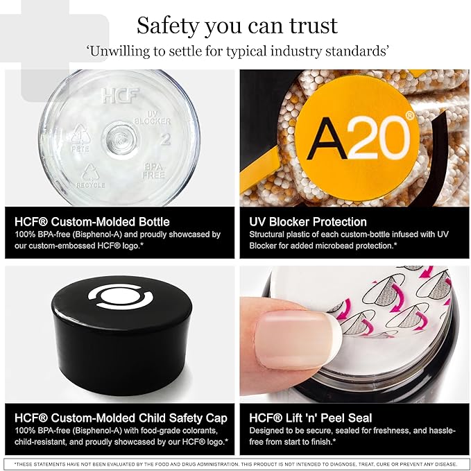 - SAFETY: Custom-molded packaging beyond industry standards. Our custom 100% BPA-free bottle infused with UV Blocker protects nutrients, while the custom child-safety cap with food-grade colorants and Lift 'n' Peel seal ensures safety, freshness, and easy access.*