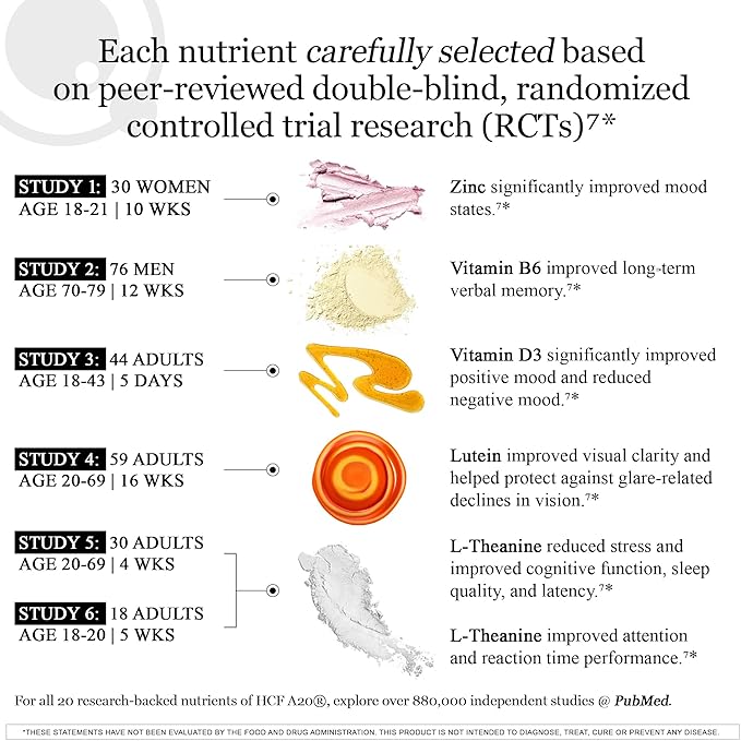 - HCF A20: Is our comprehensive daily nootropics brain support supplement + multivitamin with 20 premium forms of neuro-aminos, vitamins, minerals, and carotenoid nutrients, crafted with our advanced microbead time-release technology to ensure sustained performance throughout the day.