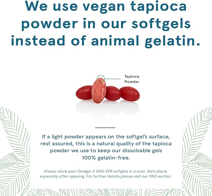 - TAILORED FOR VEGANS & VEGETARIANS - This EPA DHA supplement is suitable for vegans and vegetarians. It is Free of yeast, wheat, gluten, salt, hexane, dairy, egg, fish, animal products, byproducts or derivatives.
