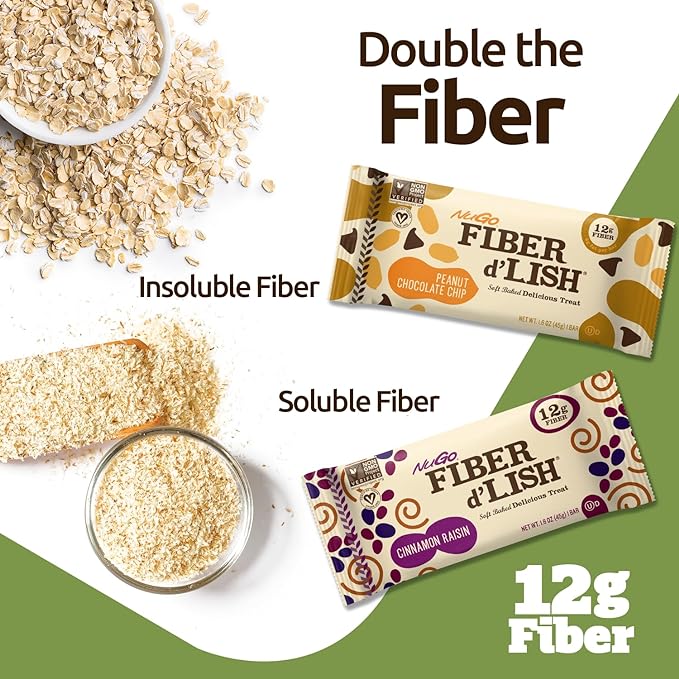 - BETTER FIBER: NuGo Fiber d’Lish contains 12g of both soluble and insoluble fiber. The power of these two forms of fiber help with weight management and regularity.
