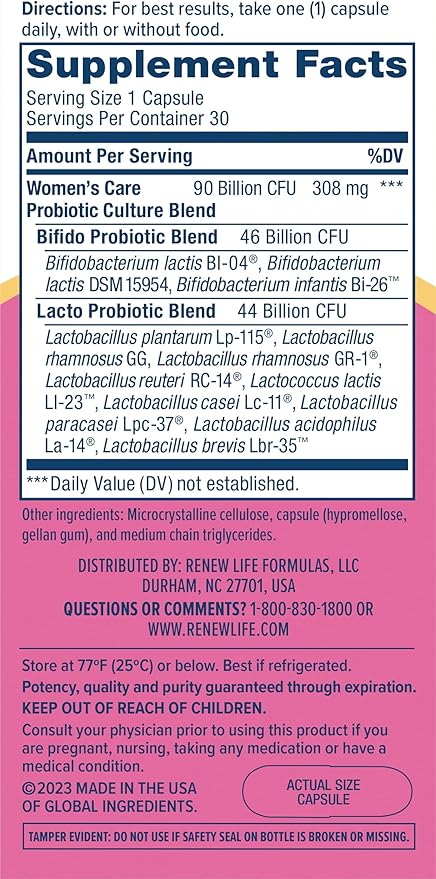 - WOMEN'S PROBIOTIC: Includes one 30-count bottle of Renew Life Women's Care Probiotic Capsules 90 Billion CFU for vaginal, urinary, digestive and immune support (1)