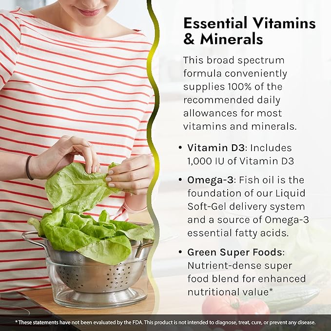 - FULL SPECTRUM SUPPORT - This broad spectrum formula conveniently supplies 100% of the recommended daily allowances for most vitamins and minerals. It features powerful antioxidants, high-energy B vitamins, and a balanced blend of trace-minerals to help fill the nutritional gap in your diet. Plus, it provides 1,000 IU of Vitamin D3 - which is emerging as one of the most important nutrients for whole body health.