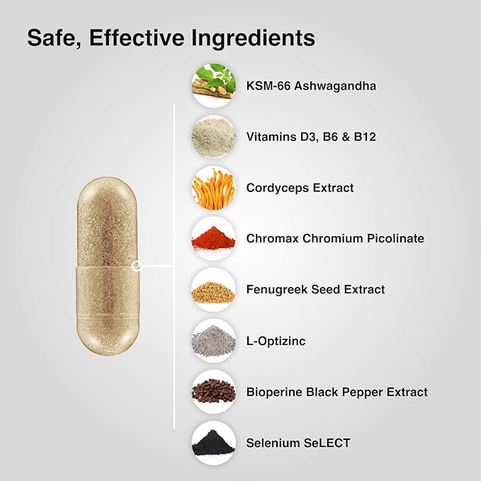 - Premium Ingredients: 600mg KSM-66 Ashwagandha, 200mcg Chromium (from Chromax), 15mg Zinc (from L-Optizinc), 5mg Bioperine, 100mcg Selenium (from Selenium SeLECT) per serving