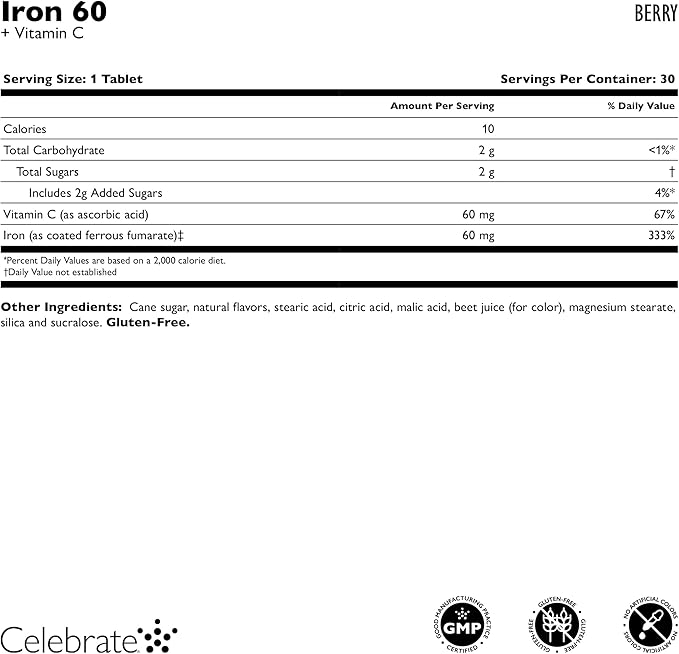 Celebrate Vitamins Iron Supplement with Vitamin C - 60mg Iron, 60mg Vitamin C, Bariatric Vitamins for WLS Patients, Vertical Sleeve & Gastric Bypass Surgery - Berry, 90 Chewable Tablets