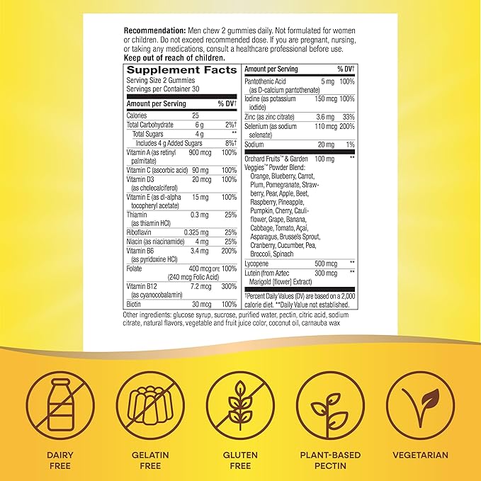 - Formulated with 15 vitamins and minerals for men’s wellness, including vitamin A, vitamin C, vitamin D3, vitamin E, vitamin B6 and vitamin B12, calcium, biotin, and zinc.* Full B-vitamin complex helps convert food to fuel.*