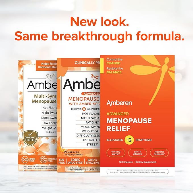 Amberen: Safe Multi-Symptom Menopause Relief. Clinically Shown to Relieve 12 Menopause Symptoms: Hot Flashes, Night Sweats, Mood Swings, Low Energy and More. 2 Month Supply