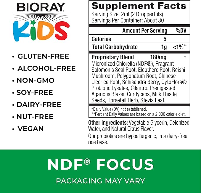 - One 60 ml. Box of bioray ndf focus, liquid herbal drops gentle herbal detox formula for kids