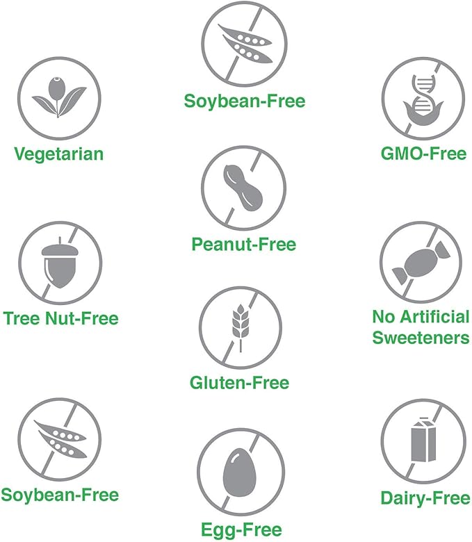 - Free from: Eggs, fish, gluten, GMO, milk, peanuts, shellfish, soy, tree nuts, wheat, corn, artificial colors, artificial flavors, and artificial preservatives