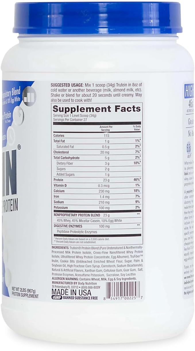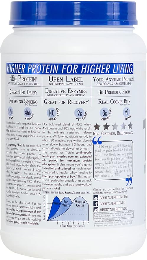 Body Nutrition Trutein High Protein Powder: 45% Whey, 45% Casein, 10% Egg White Protein Shake Mix, Low Sodium, Low Carb Protein Supplement Powder for Men & Women, Cookies & Cream, 2lb
