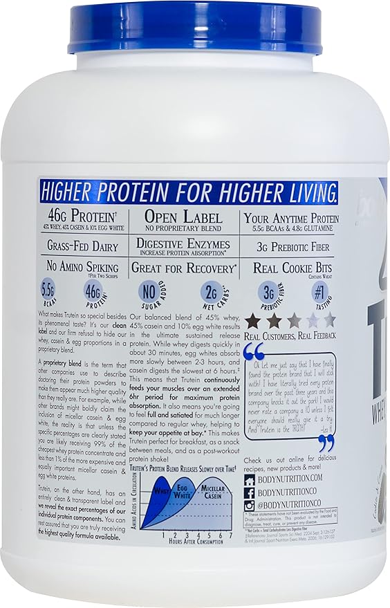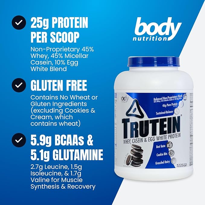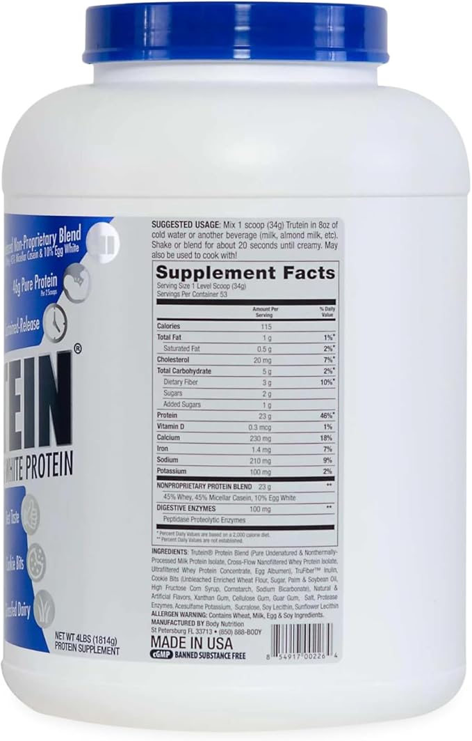 Body Nutrition Trutein High Protein Powder: 45% Whey, 45% Casein, 10% Egg White Protein Shake Mix, Low Sodium, Low Carb Protein Supplement Powder for Men & Women, Cookies & Cream, 4lb