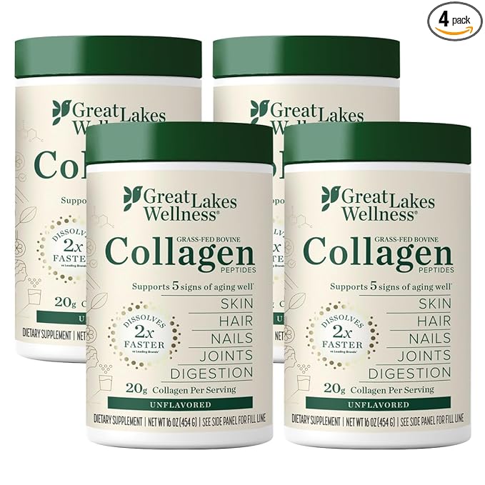Great Lakes Wellness Collagen Peptides Powder for Skin, Hair, Nails, Joints & Digestion - Unflavored - Quick Dissolve Hydrolyzed, Non-GMO, Keto, Kosher - 16oz - 4 Pack - Packaging May Vary