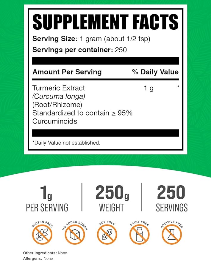 BulkSupplements.com Turmeric Extract Powder - from Turmeric Root, Curcumin Supplements 1000mg, Turmeric Curcumin Powder - Gluten Free, 1000mg per Serving, 250g (8.8 oz) (Pack of 1)