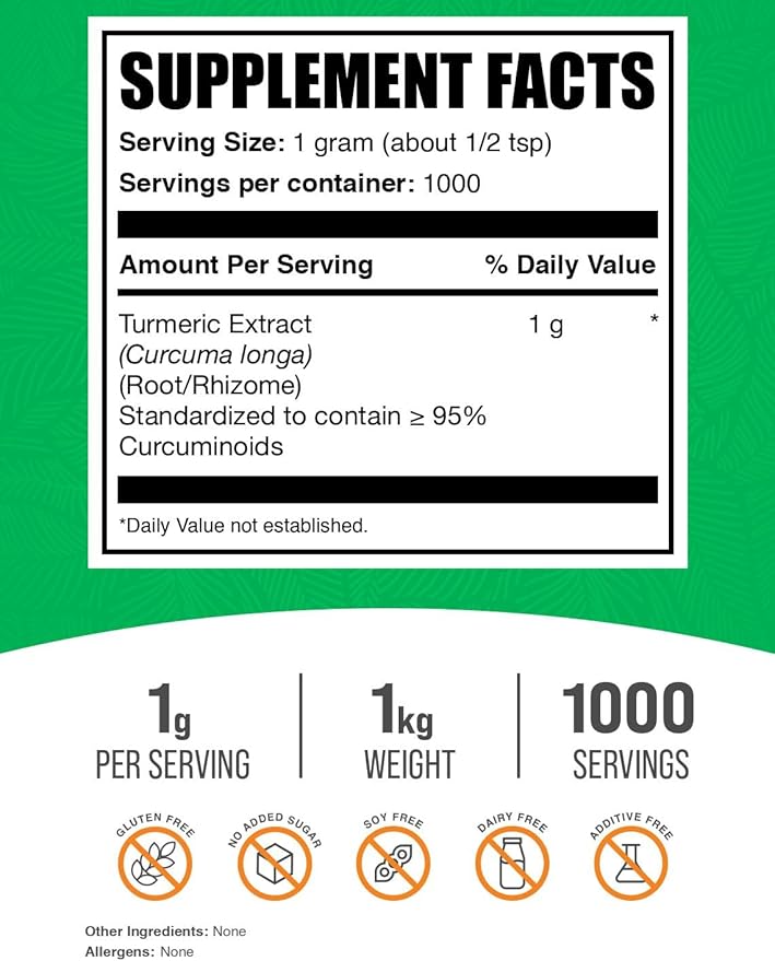 BulkSupplements.com Turmeric Extract Powder - from Turmeric Root, Curcumin Supplements 1000mg, Turmeric Curcumin Powder - Gluten Free, 1000mg per Serving, 1kg (2.2 lbs) (Pack of 1)
