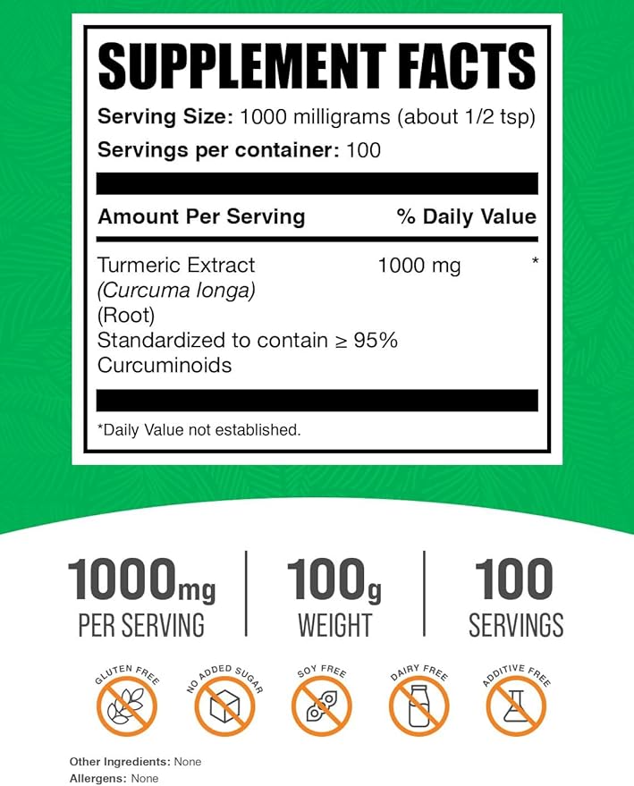 BulkSupplements.com Turmeric Extract Powder - from Turmeric Root, Curcumin Supplements 1000mg, Turmeric Curcumin Powder - Gluten Free, 1000mg per Serving, 100g (3.5 oz) (Pack of 1)