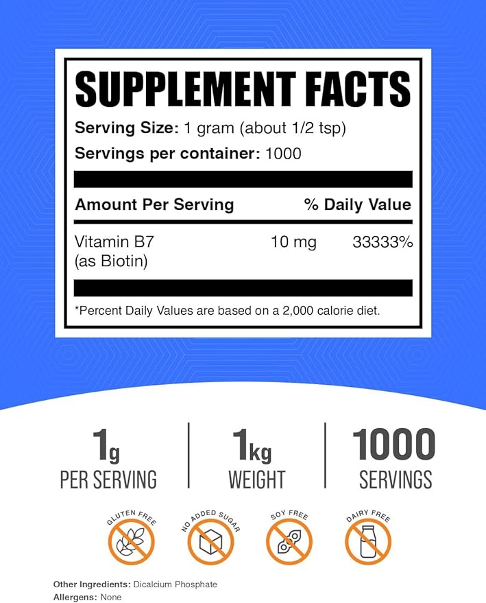 - Daily Dose of Well-being: Incorporating our Biotin 10000mcg powder, prodiving 10mg of Vitamin B7 Biotin per serving, into your daily routine is a simple, yet profound way to invest in your long-term health. A small step today paves the way for substantial wellness benefits tomorrow.