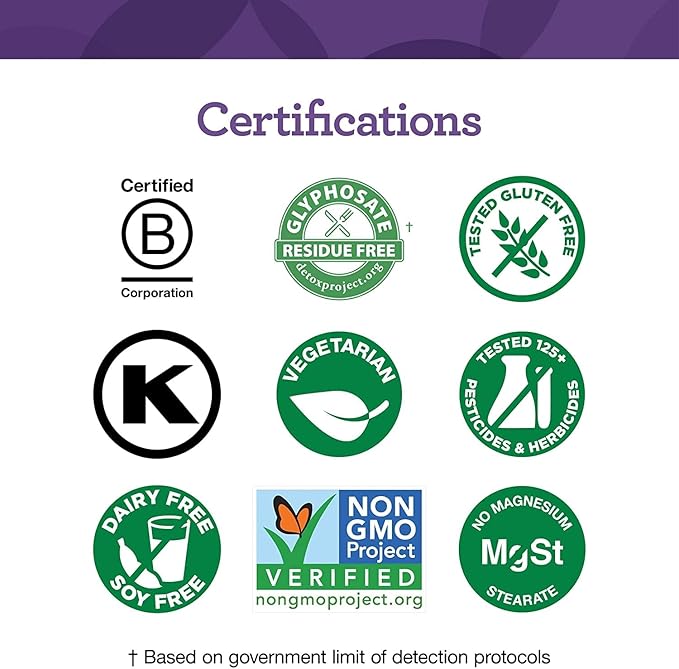 - Put To The Test: Non-GMO; Certified B Corp; Certified Kosher; Tested for over 125 chemical substances; Free of gluten, dairy and soy