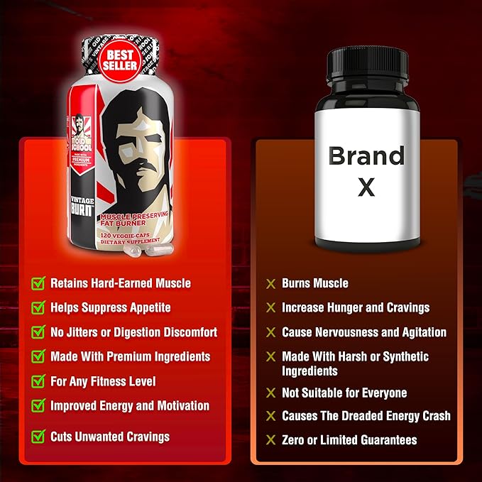 - A Different Fat Burner: The problem with other fat burners is that they also make you lose muscle, which decreases your base metabolic rate (BMR) and stops your progress. Vintage Burn is different. It focuses on preserving your hard-earned muscle while speeding up the body’s metabolism to burn fat and only fat.