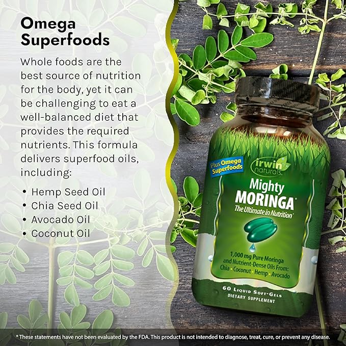 Irwin Naturals Mighty Moringa 1,000 mg - 60 Liquid Softgels - with Chia, Coconut, Hemp, Avacado & Omega Superfoods - 30 Total Servings