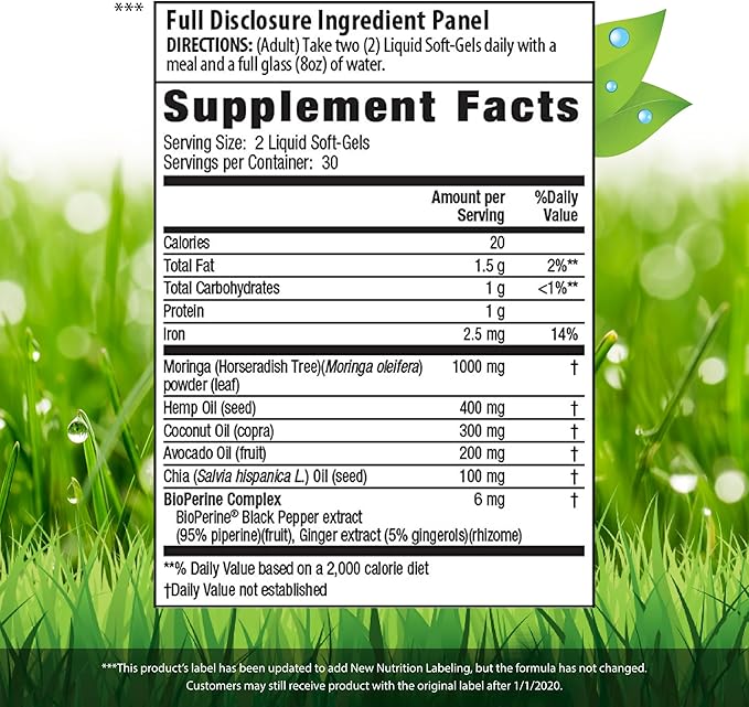 - Model Name : Mighty Moringa 1,000 mg with Chia, Coconut, Hemp, Avacado & Omega Superfoods - 60 Liquid Softgels Mighty Moringa 1,000 mg with Chia, Coconut, Hemp, Avacado & Omega Superfoods - 60 Liquid Softgels