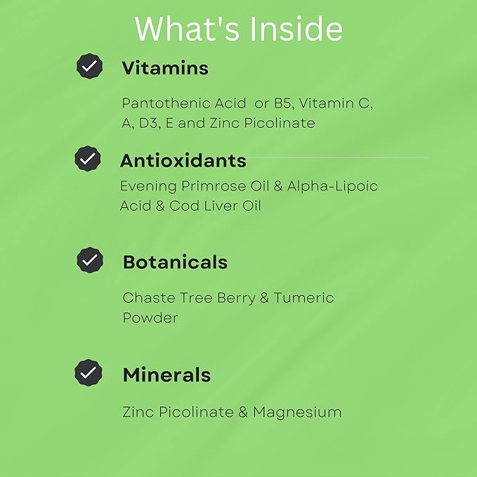 - Rich in Plant-Based Ingredients: Crafted with nature's finest, including chaste tree berry, turmeric, and 20 different supplements, this acne medicine is loaded with vitamins A, B5, D3, E, Zinc, and antioxidants to clear and enhance your skin inside out.