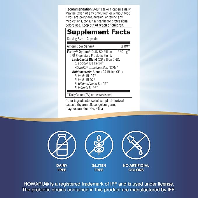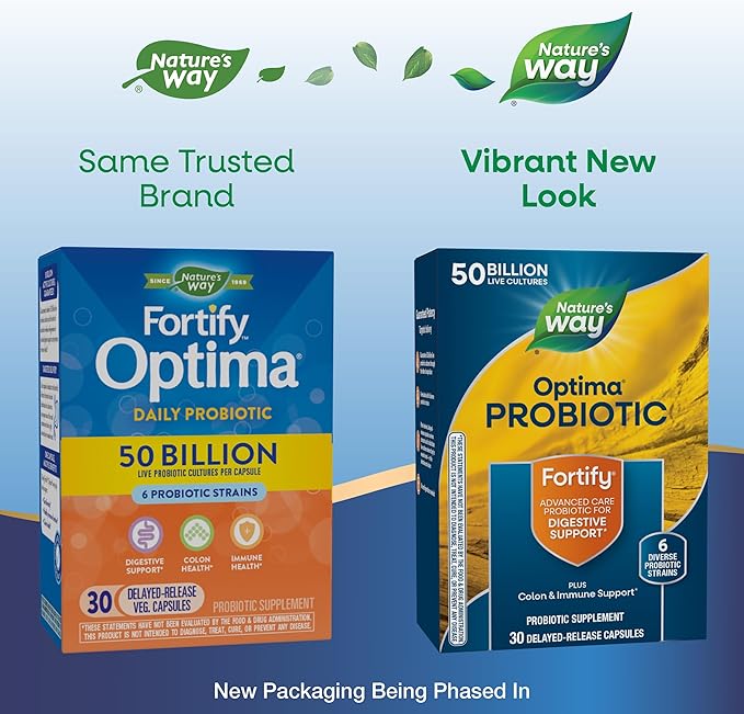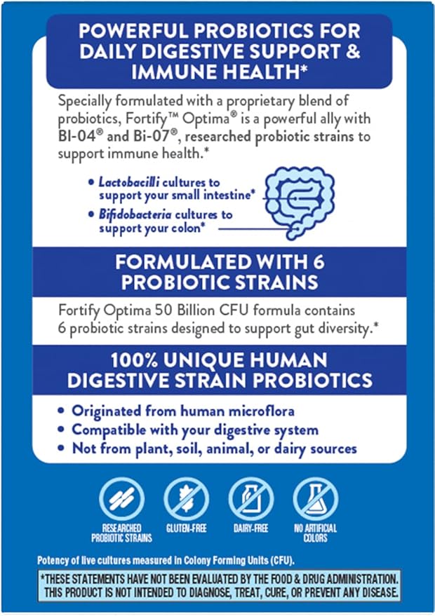 - Nature's Way Fortify Optima Probiotic for Adults with 50 billion live cultures is a daily advanced care probiotic supplement formulated with 6 diverse probiotic strains to support digestive and immune health.*