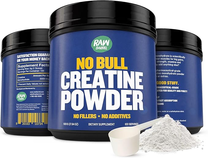 - Pure Power, No Additives - Elevate your workouts with Raw Barrel's "No Bull" Creatine Powder. Our monohydrate creatine is pure, clean, and rigorously laboratory tested. You can trust this non-GMO, keto, sugar-free, gluten-free, soy-free, and caffeine-free monohydrate creatine supplement for a clean and effective boost.