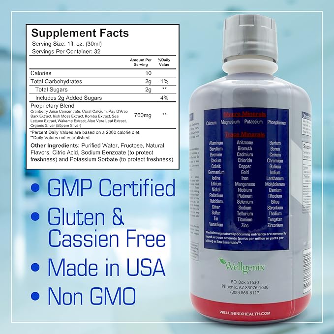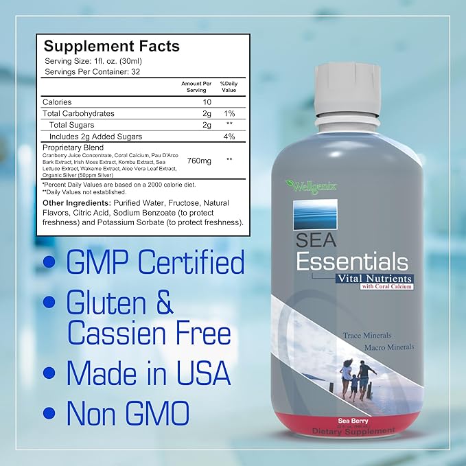 Wellgenix Sea Essentials Coral Calcium Liquid Vitamin for High Absorption - Nutritional Multivitamin Supplement - Sea Berry Flavor (32 oz) (1 Pack)