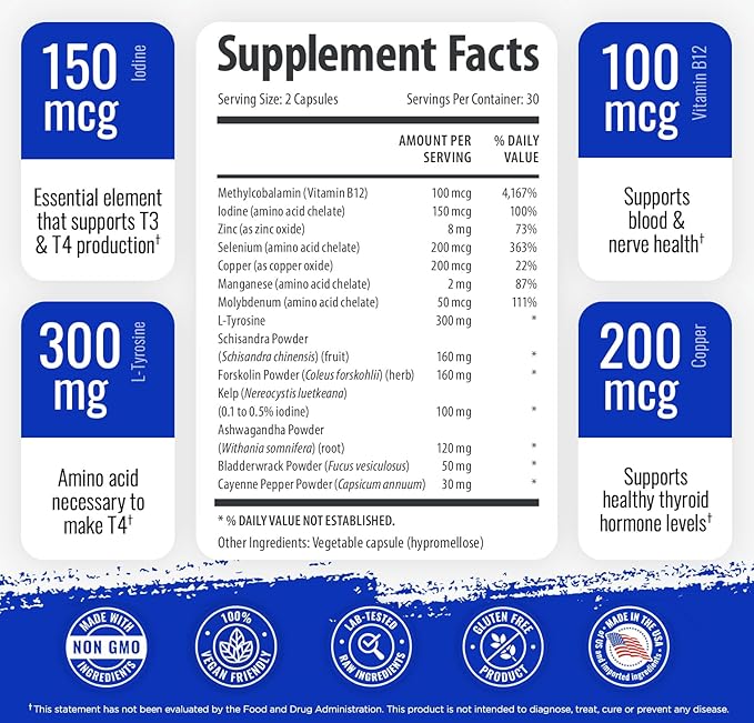 1 Body Thyroid Support Supplement with Iodine, B12, Zinc, Selenium, Ashwagandha, Non-GMO, Vegetarian, 30 Day Supply