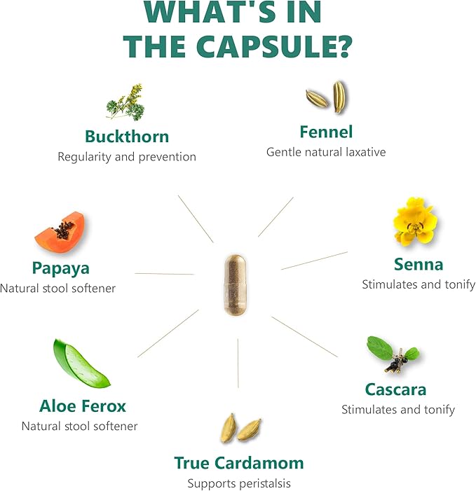 - 100% NATURAL INGREDIENTS : Carica Papaya, Aloe Ferox, Cassia Angustifolia, Rhamnus Frangula, Rhamnus Purshiana (Cascara sagrada), Elettaria Cardamome, Foeniculum Vulgare. All-natural herbal formula to ease digestion, regulate metabolism, relieve the symptoms of constipation, and most importantly help strengthen and support the digestive system.