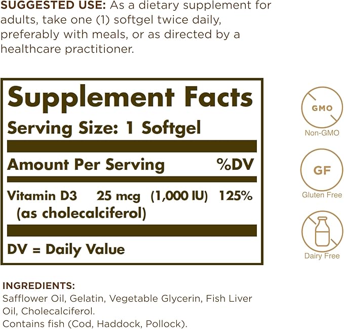 - Support Your Immune System; Solgar Vitamin D3 (Cholecalciferol) 25mcg (1000 IU) Softgels support a healthy immune system and neuromuscular function