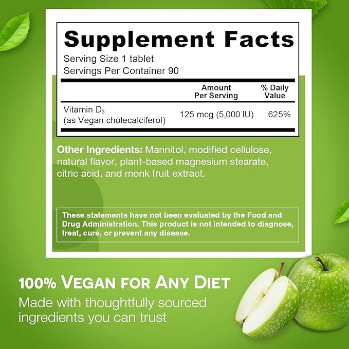 - Start a Daily Routine — Make it simple to work your Vitamin D3 melts into your busy schedule. Delight in these tasty green apple vitamin dissolving tablets that are easy to take, even on the go. No more sugary vitamins, just plant-derived sweeteners