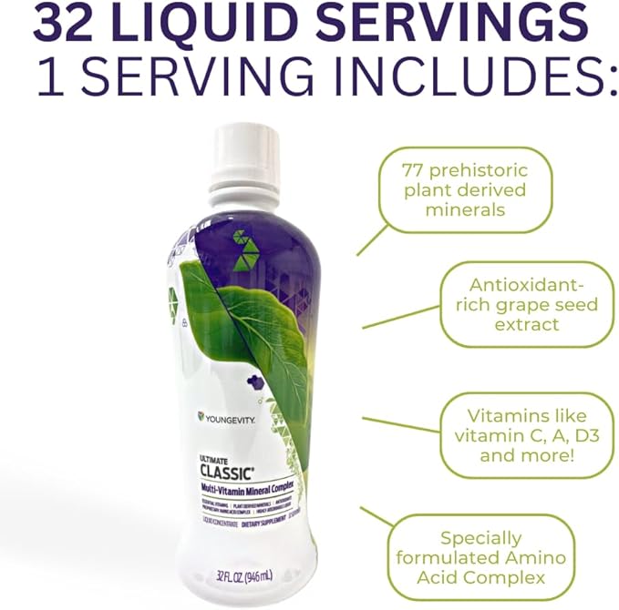 Youngevity Ultimate Classic® - Mega Multi-Vitamin & Mineral Complex - 16 Vitamins, 70+ Minerals, 12+ Amino Acids, Grape Seed, CoQ10, and More - Highly Absorbable Liquid (32 Fl Oz - Pack of 1)