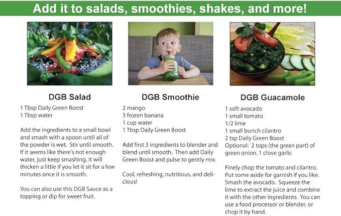 - For Best Results enjoy one serving everyday. You can start with 1 Tsp per serving and increase gradually over time. It goes well with sweet ripe fruit. Boost Your Juice!: Add 2 oz - 12 oz of your favorite juice to a tall glass or water bottle, then add 2 TBSP of Daily Green Boost. Mix and enjoy. See additional recipes in the image section above