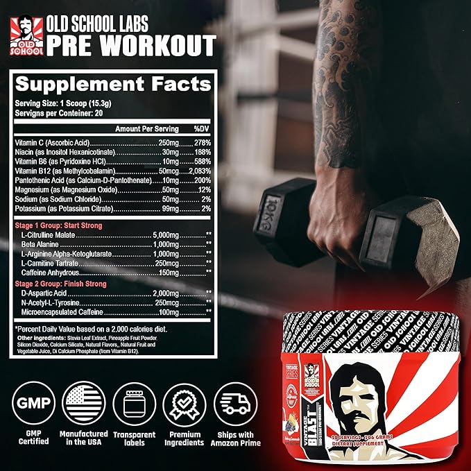 Old School Labs Ultimate 2 Stage Pre Workout for Explosive Energy, Massive Pumps & Laser Focus - Preworkout for Men & Women - Pre Workout Powder with Amino Acids - Natural Ingredients & 250mg Caffeine