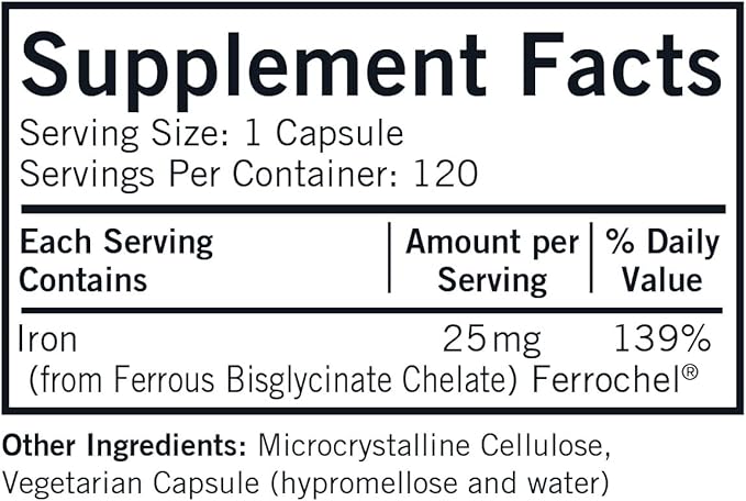 - POTENT IRON SUPPLEMENT: 25mg of Iron from Ferrochel (138% of recommended daily value) helps increase energy and decrease fatigue without nausea or constipation.*