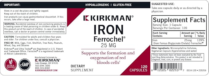 - ADVANCED ABSORPTION: Kirkman’s Iron Capsules made with ferrous Bisglycinate chelate (Ferrochel), which is more tolerable and bioavailable than ferrous sulfate.*