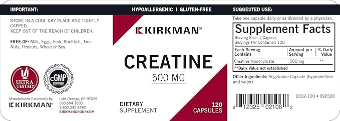 Kirkman Creatine 500 mg - Hypoallergenic | 120 Vegetarian Capsules | Amino Acid