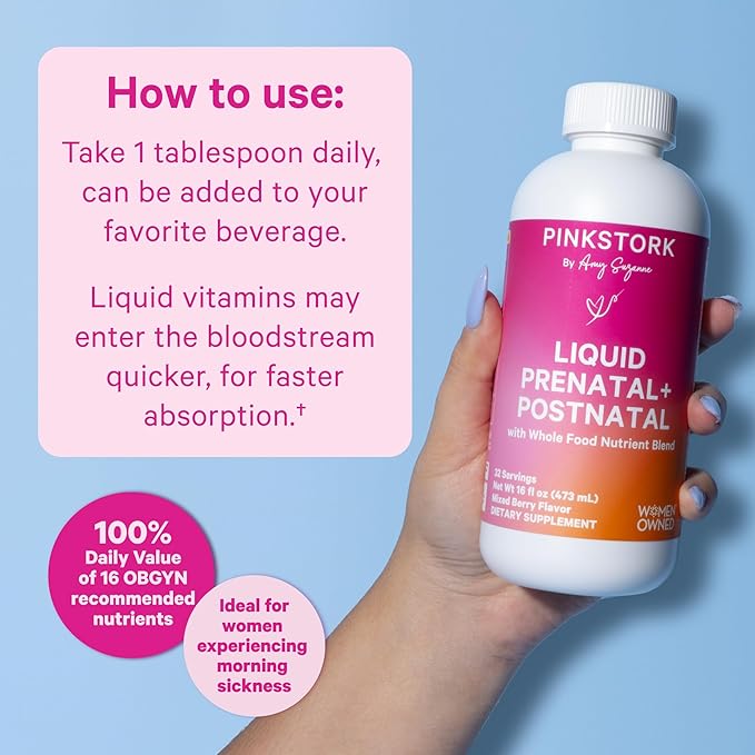 - Liquid Multivitamin: Pink Stork Liquid Prenatal + Postnatal multivitamin and mineral blend features 100% of 14 OBGYN-recommended vitamins from organic, whole-food blends, including real Folate (the natural form of Folic Acid), Vitamin C, Vitamin D, B Complex vitamins (including vitamin B6 and vitamin B12), Vitamin E, Zinc, and more. Liquid multivitamins are absorbed by the body more efficiently than prenatal vitamin gummies or capsule supplements - continue as your Postnatal Vitamin of choice!