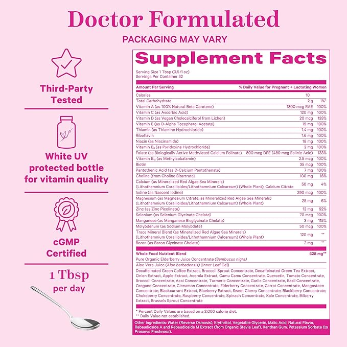 - Preconception, Pregnancy, Postpartum: Our prenatal vitamins for women contain natural, whole-food ingredients - including nutrients from elderberries, spinach, ginger, acerola cherry concentrate, acai concentrate, kale, and more. Take one tablespoon of your liquid morning multivitamin daily, a 32-day supply. It’s easy to swallow and can mix into your favorite beverage or drink mix! A great addition to your daily ritual, whether you are trying to conceive, pregnant, or postpartum! Store in the refrigerator for best results.