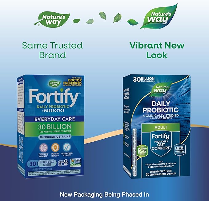 Nature's Way Fortify Daily Probiotic + Prebiotic for Men and Women, 30 Billion Live Cultures, Digestive and Immune Health Support* Supplement, 30 Capsules (Packaging May Vary)