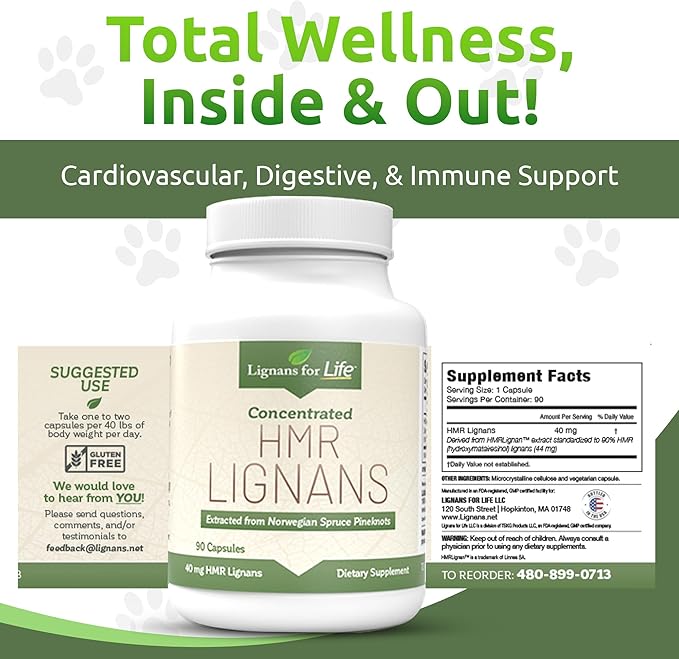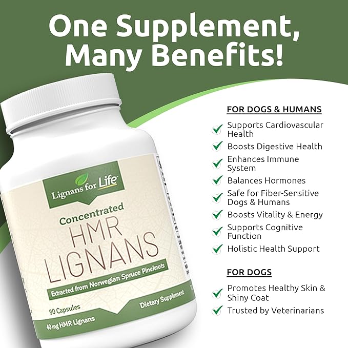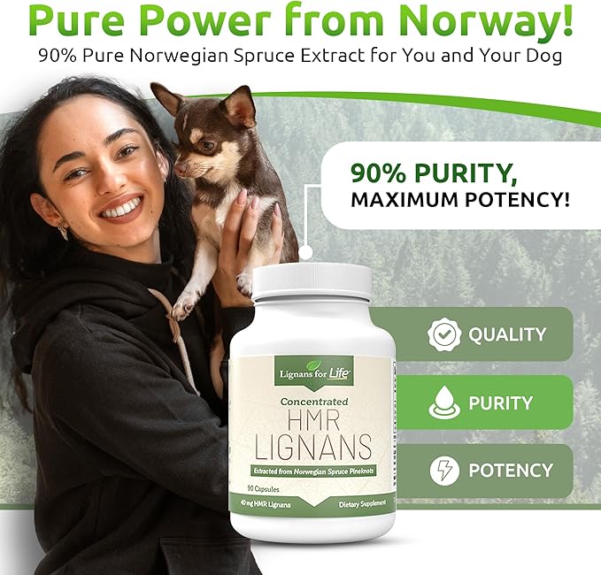 - PREMIUM NORWEGIAN SPRUCE SOURCE: Extracted from Norwegian Spruce knots, our HMR Lignans feature a 90% purity level. This potent, high-quality source maximizes benefits for your dog's health, offering effective support for vitality, heart health, digestion, skin and coat condition, immune system strength, and overall well-being.