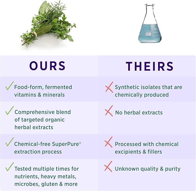 - WOMEN’S DAILY MULTIVITAMIN: Each bottle (120 tablets) provides a comprehensive daily supply of essential vitamins and minerals for women from whole foods and 20+ organic herbal extracts for targeted support.