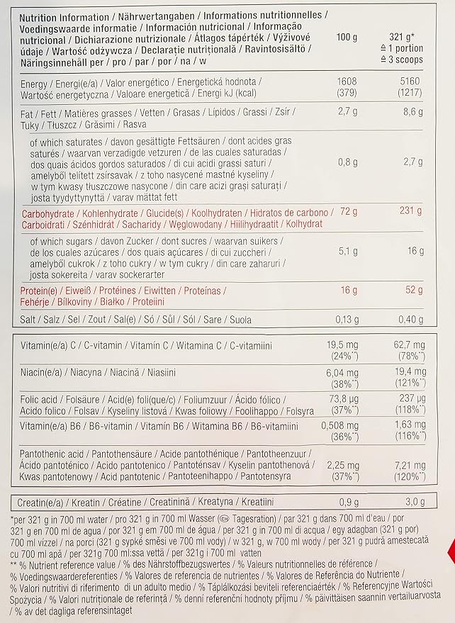 - 1280 calories and 245g carbs per serving to help even the hardest gainers pack on mass