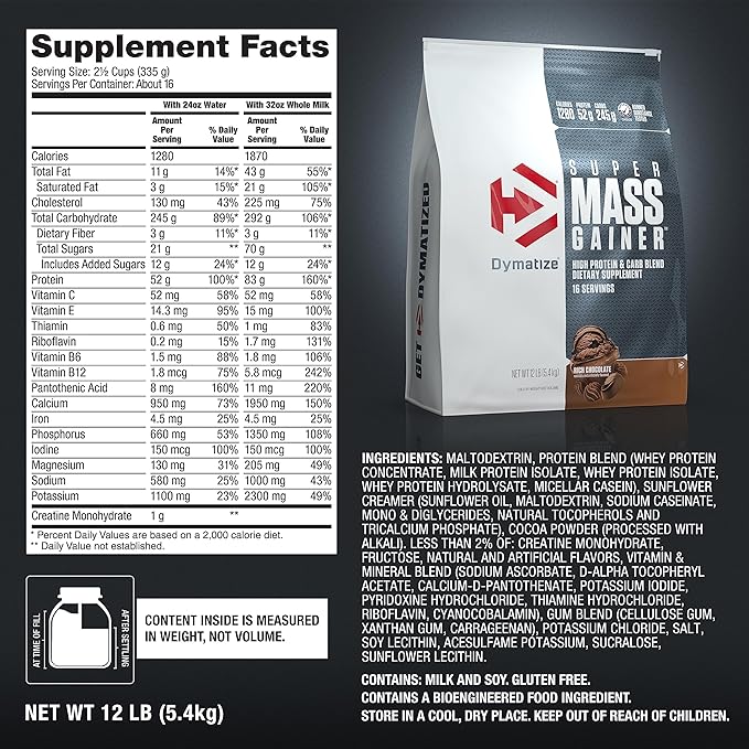 Dymatize Super Mass Gainer Protein Powder, 1280 Calories & 52g Protein,10.7g BCAAs, Mixes Easily, Tastes Delicious, Rich Chocolate, 12 lbs
