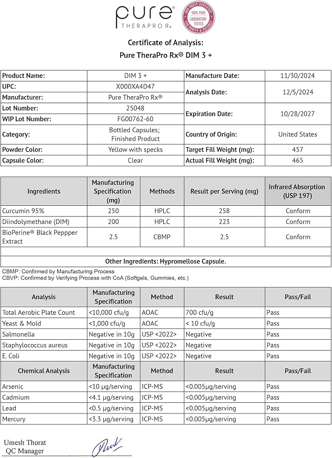 - POTENCY & PURITY: Pure TheraPro Rx’s DIM 3+ features 200mg of Diindolylmethane (DIM) as well as 250mg of Curcumin from Turmeric extract and 2.5mg of BioPerine for enhanced absorption. DIM 3+ is non-GMO, soy-free, and gluten-free, and does not contain any magnesium stearate or fillers. Purity is our Priority! Our DIM 3+ is manufactured in an NSF & GMP-certified facility in the USA.