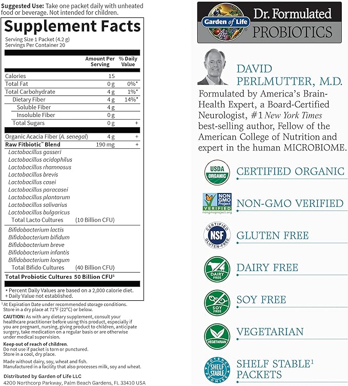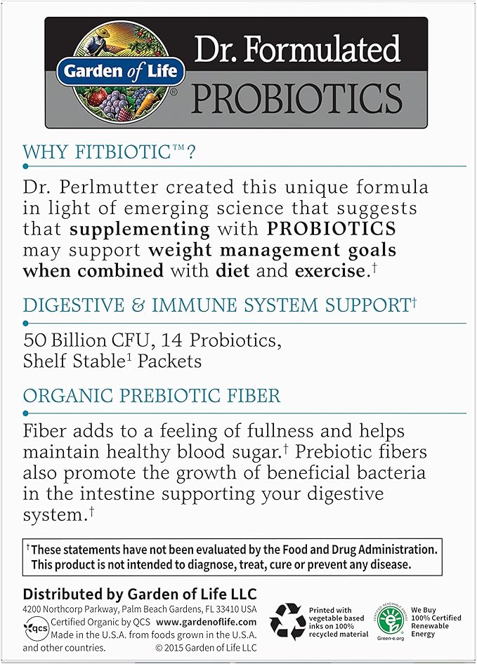 Garden of Life Dr. Formulated Probiotics Fitbiotic Weight Management Powder 50 Billion CFU & Fiber, Organic & Non-GMO Digestive Gut Health Supplement, 3 Oz, Pack of 20