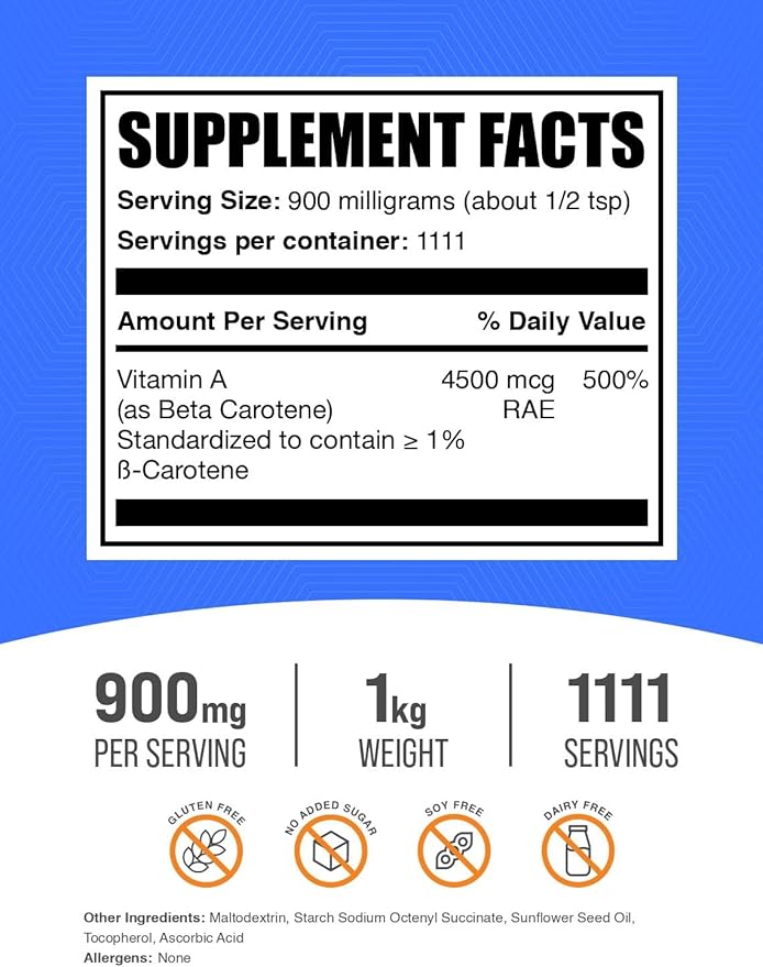 - ✔️ Easy to Take - Getting your nutrients from food is always the best option, but sometimes that's not possible. That where our Beta Carotene Powder, which is sourced from natural ingredients and provides 4500 mcg RAE (or 900 mg) of Beta Carotene, and it's free of gluten, dairy and especially soy. It's also available in Beta Carotene 25000 IU Softgels for easy to take on the go supplement.