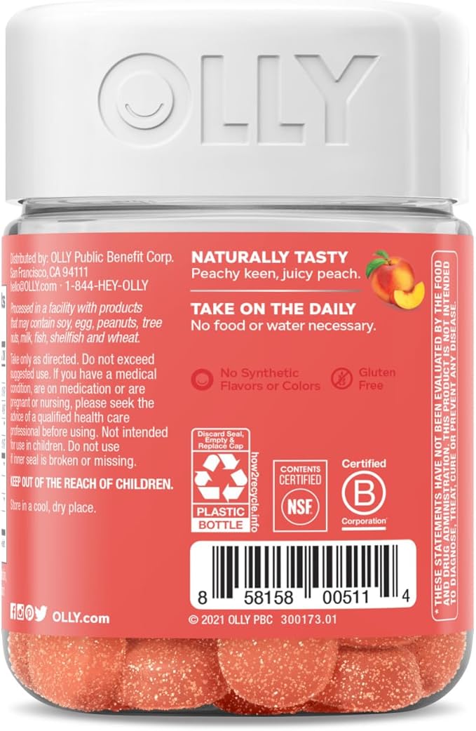 OLLY Probiotic + Prebiotic Gummy, Digestive Support and Gut Health, 500 Million CFUs, Fiber, Adult Chewable Supplement for Men and Women, Peach, 30 Day Supply - 30 Count