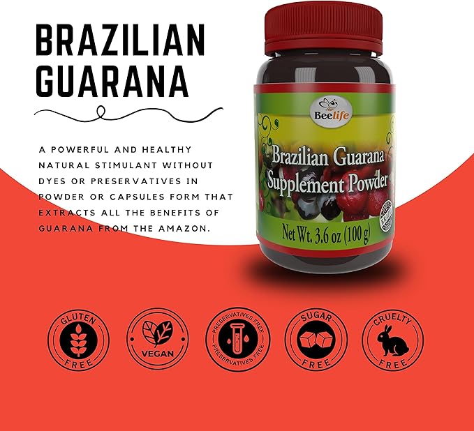 Beelife Brazilian Guarana Powder - Natural Caffeine Supplements from Brazil - Energy & Mental Focus, Muscle Strength Support - Zero Gluten, No Sugar Vegan Pre Workout for Men & Women - 100g