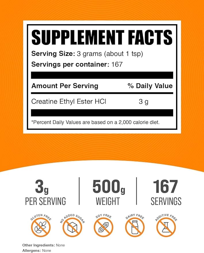BulkSupplements.com Creatine Ethyl Ester HCl Powder - Creatine Supplement, Creatine Ethyl Ester Powder - Unflavored & Gluten Free, 3g per Serving, 500g (1.1 lbs) (Pack of 1)